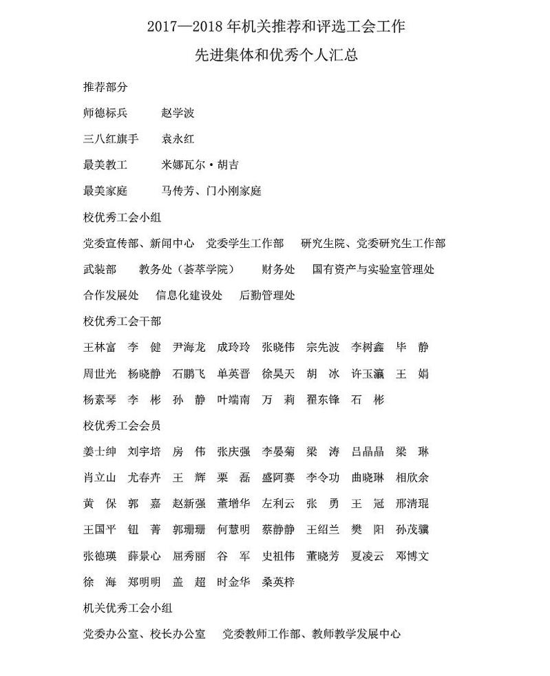 2017—2018年机关推荐和评选工会工作先进集体和优秀个人汇总